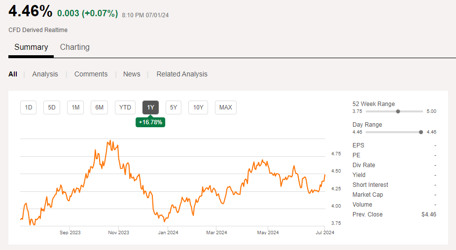 따라서, 미국 10년물 국채 금리는 4.5% 가까이 기록하며 떨어지지 않고 있습니다.