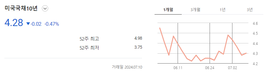 금일 연준 파월 의장의 금리인하에 대한 비둘기파적인 발언을 보이며 10년물 국채금리는 하락 마감하였습니다.