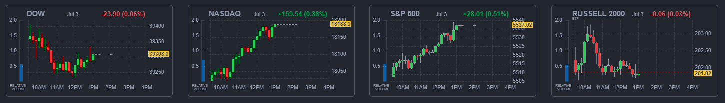 2024년 7월 3일(수) 미국 증시는 부진한 경제 지표에도 불구하고 상승 마감하였습니다.