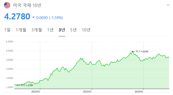 미국 10년물 국채는 큰 폭 하락을 하여 4.28%를 기록하였으며