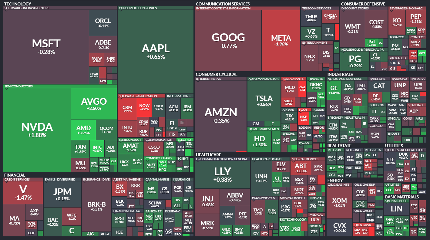 금일 미국 증시는 엔비디아를 포함한 반도체 기업의 상승으로 나스닥 종합지수를 0.3% 상승시켰으며 S&P 500 지수는 0.1% 소폭 상승하며 이번해 35번째 최고치를 기록하였습니다.
